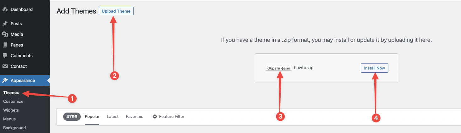 Navigate to Appearance -> Themes to access the theme uploader screen and use the howto.zip file.