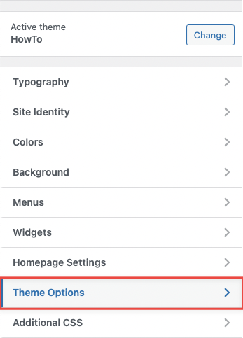 WordPress Theme HowTo comes with a comprehensive set of options that you can manage within the WordPress live customizer panel. Once you go to Appearance -> Customize, you will be able to see the main tab which opens the HowTo theme settings (besides the default sections that come with WordPress by default).